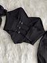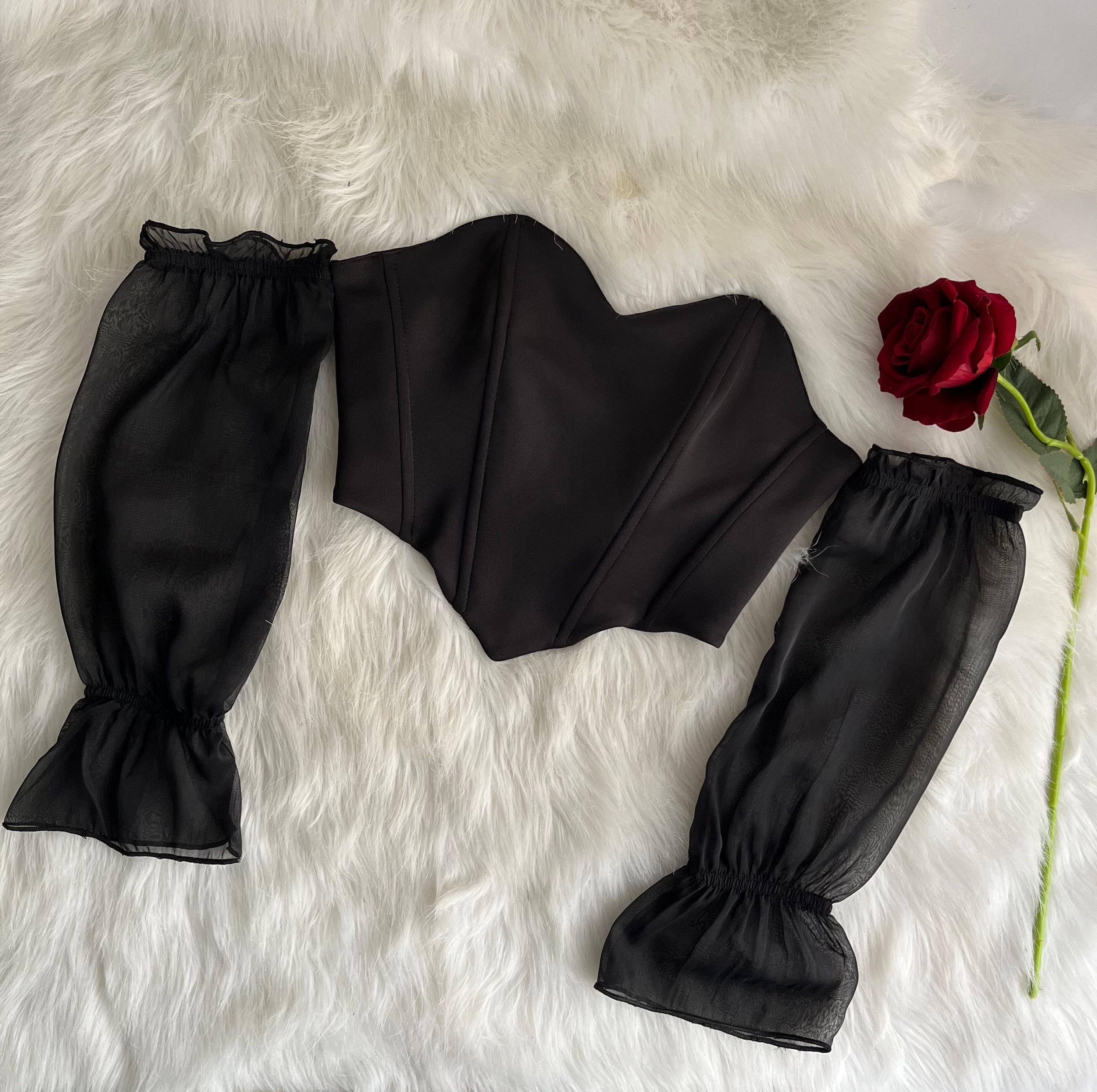 CROPTOP ESTILO SEMICORSET STRAPPLES EN TELA SEMIELASTICA FORRADO CON VARILLAS MOLDEABLES PLÁSTICAS, TIRAS DE ENGANCHE EN ESPALDA Y MANGAS EN VELO.