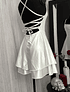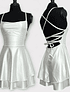 Vestido corto en satín con falda semiacampanada, tiras de amarre en espalda.